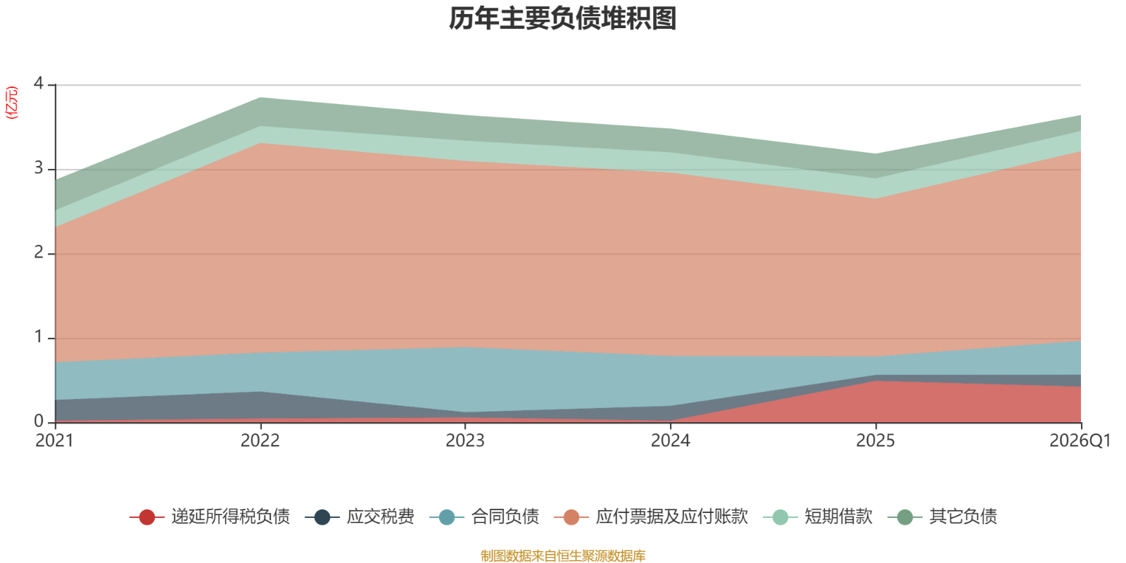 负债重大变化方面,截至2026年一季度末,公司应付票据及应付账款较上年末增加20.18%,占公司总资产比重上升0.74个百分点;合同负债较上年末增加83.61%,占公司总资产比重上升0.41个百分点;应付职工薪酬较上年末减少69.04%,占公司总资产比重下降0.22个百分点;递延所得税负债较上年末减少14.16%,占公司总资产比重下降0.2个百分点。