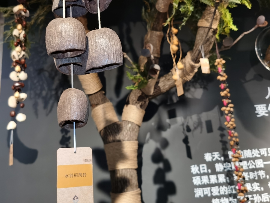 静安雕塑公园艺术中心B2层的“种子+潮玩+文创”区域内,静安园林公司副经理王蔚推销起了员工“手搓”的榼藤娃娃、种子心愿瓶和果壳风铃。