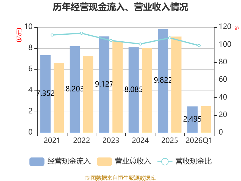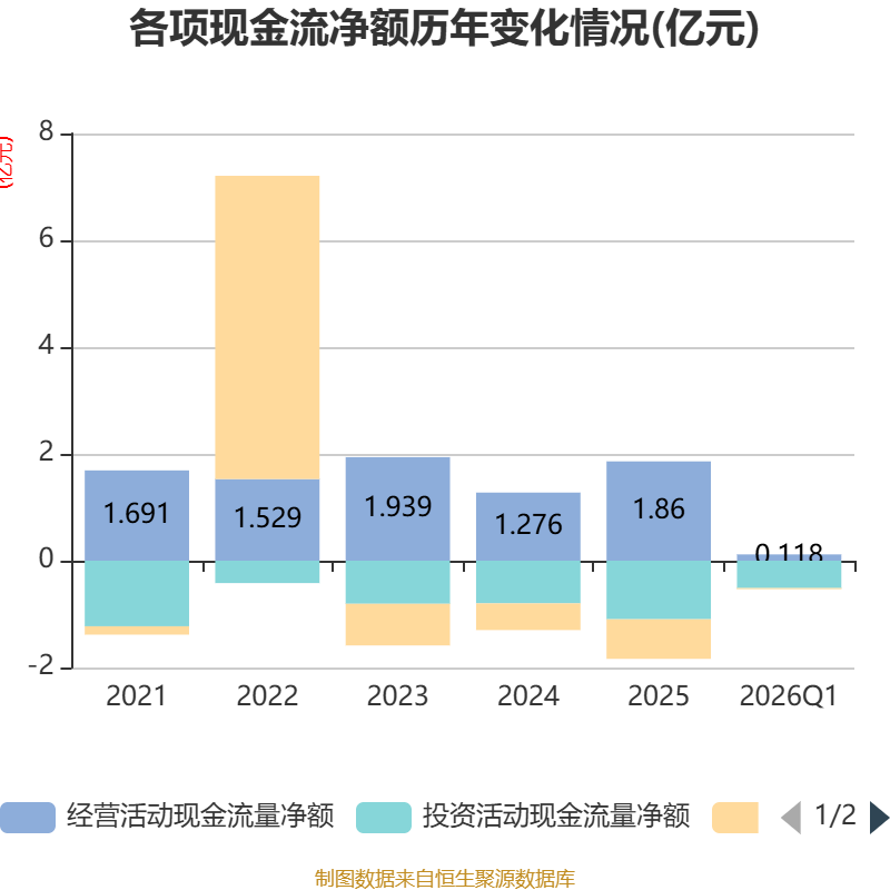 截至2026年一季度末,公司经营活动现金流净额为1178.09万元,同比下降77.35%;筹资活动现金流净额-197.87万元,同比减少330.92万元;投资活动现金流净额-5131.49万元,上年同期为-6819.17万元。
