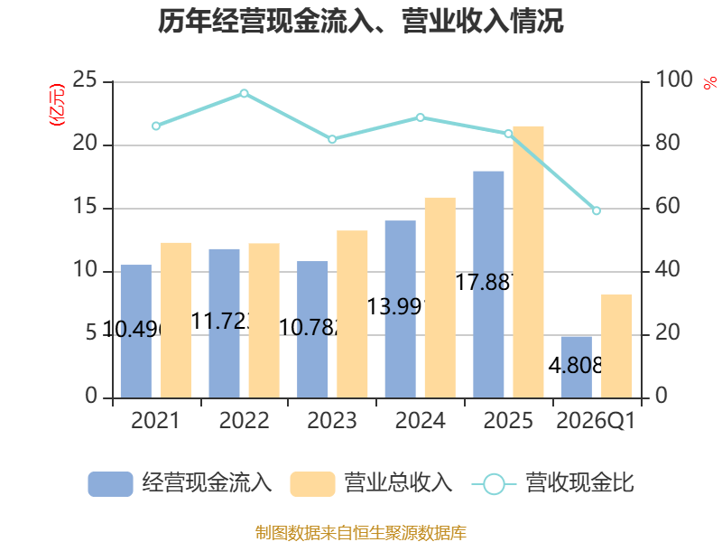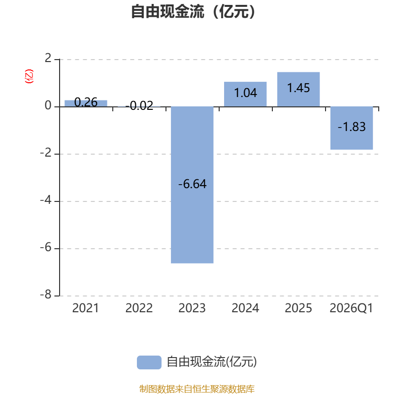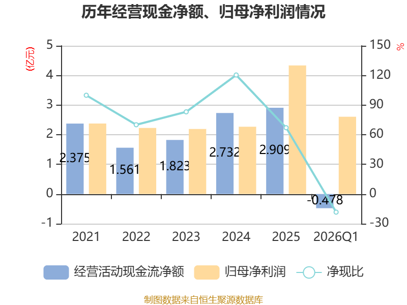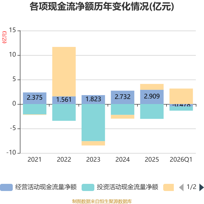 截至2026年一季度末,公司经营活动现金流净额为-4776.11万元,同比减少3908.05万元;筹资活动现金流净额3.17亿元,同比增加2.34亿元;投资活动现金流净额-8737.47万元,上年同期为-7689.45万元。