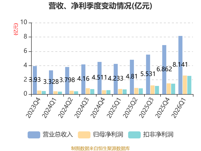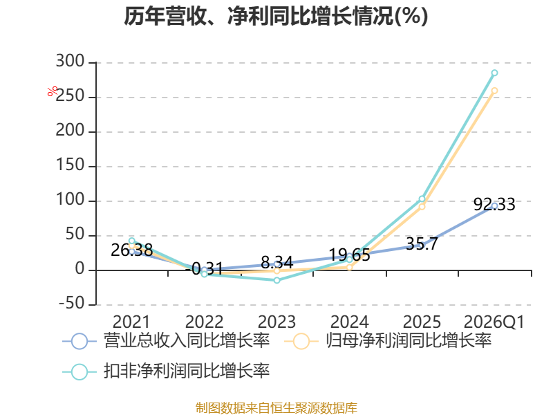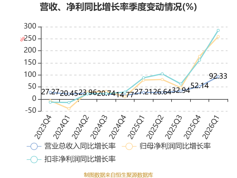中证智能财讯鼎泰高科(301377)4月16日披露2026年第一季度报告。公司实现营业总收入8.14亿元,同比增长92.33%;归母净利润2.61亿元,同比增长259.00%;扣非净利润2.55亿元,同比增长284.74%;经营活动产生的现金流量净额为-4776.11万元,上年同期为-868.06万元;报告期内,鼎泰高科基本每股收益为0.64元,加权平均净资产收益率为9.38%。