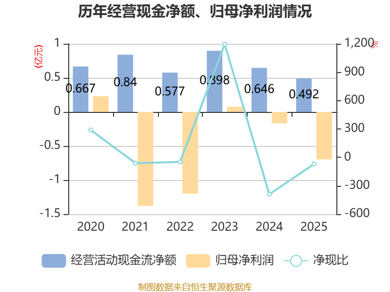 截至2025年,公司经营活动现金流净额为4917.81万元,同比下降23.9%;筹资活动现金流净额-1.09亿元,同比减少1.05亿元;投资活动现金流净额-1975.5万元,上年同期为-4016.78万元。