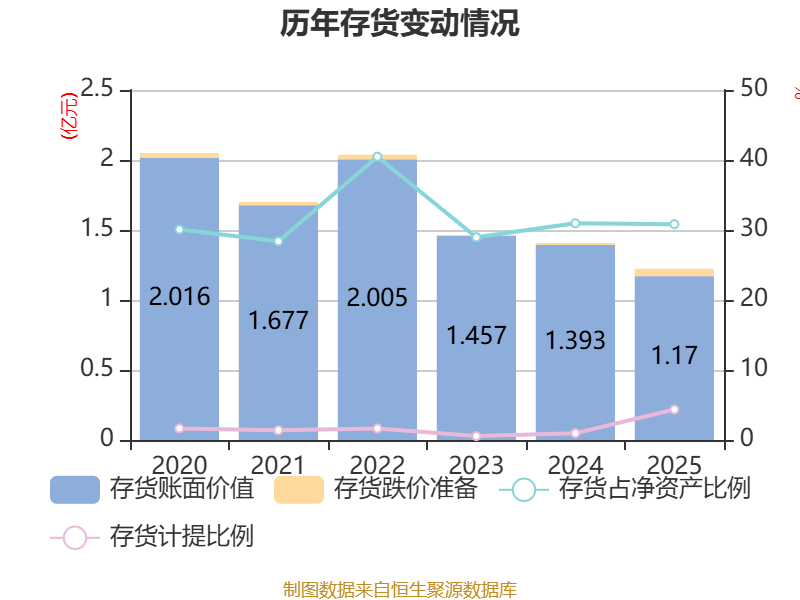 从存货变动来看,截至2025年末,公司存货账面价值为1.17亿元,占净资产的30.83%,较上年末减少2230.89万元。其中,存货跌价准备为531.75万元,计提比例为4.35%。