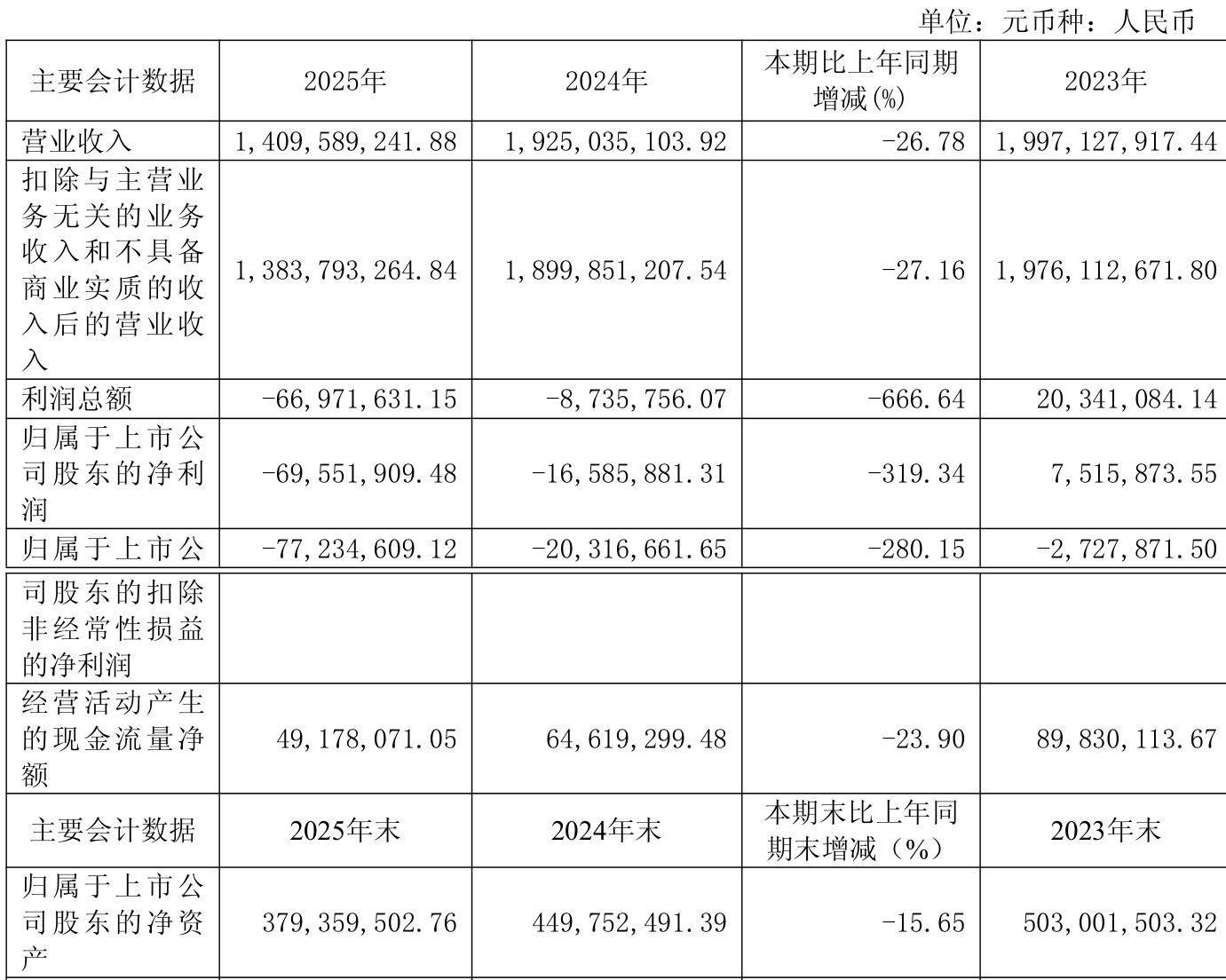 中证智能财讯惠发食品(603536)4月16日披露2025年年度报告。2025年,公司实现营业总收入14.10亿元,同比下降26.78%;归母净利润亏损6955.19万元,上年同期亏损1658.59万元;扣非净利润亏损7723.46万元,上年同期亏损2031.67万元;经营活动产生的现金流量净额为4917.81万元,同比下降23.90%;报告期内,惠发食品基本每股收益为-0.28元,加权平均净资产收益率为-16.78%。
