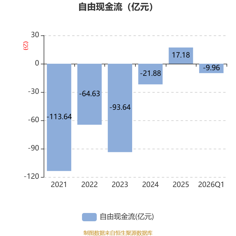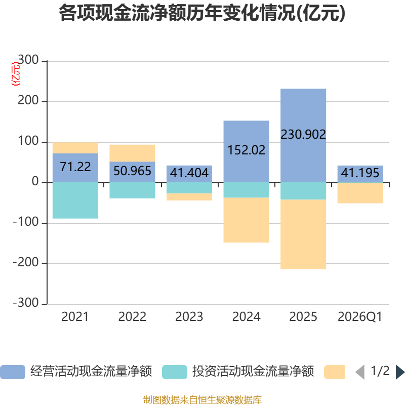 截至2026年一季度末,公司经营活动现金流净额为41.19亿元,同比增长70.4%;筹资活动现金流净额-50.71亿元,同比减少36.39亿元;投资活动现金流净额-1.18亿元,上年同期为-11.69亿元。