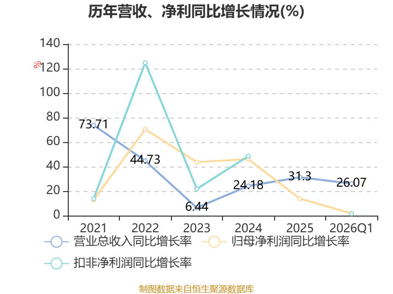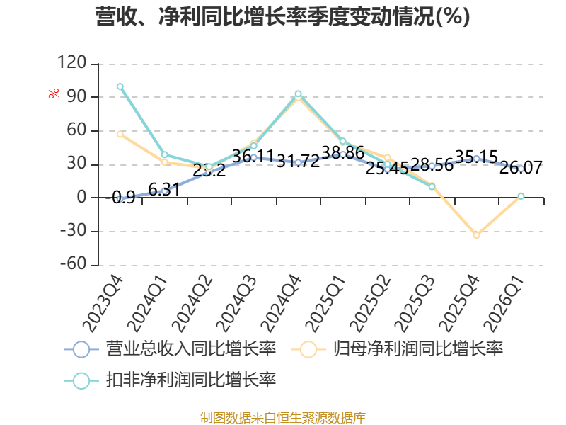 中证智能财讯春风动力(603129)4月16日披露2026年第一季度报告。公司实现营业总收入53.59亿元,同比增长26.07%;归母净利润4.23亿元,同比增长1.81%;扣非净利润4.17亿元,同比增长1.55%;经营活动产生的现金流量净额为-3.63亿元,上年同期为7.92亿元;报告期内,春风动力基本每股收益为2.77元,加权平均净资产收益率为5.54%。