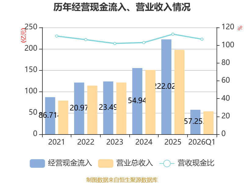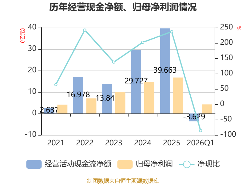 截至2026年一季度末,公司经营活动现金流净额为-3.63亿元,同比减少11.55亿元;筹资活动现金流净额8354.76万元,同比减少3838.82万元;投资活动现金流净额-3.79亿元,上年同期为-1.12亿元。