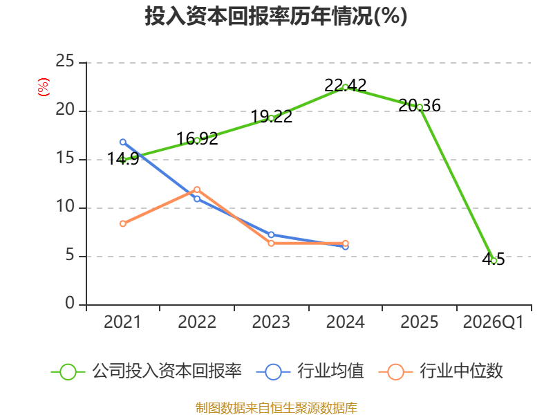 盈利能力方面, 2026年一季度公司加权平均净资产收益率为5.54%,同比下降0.9个百分点。公司2026年第一季度投入资本回报率为4.5%,较上年同期下降1.15个百分点。