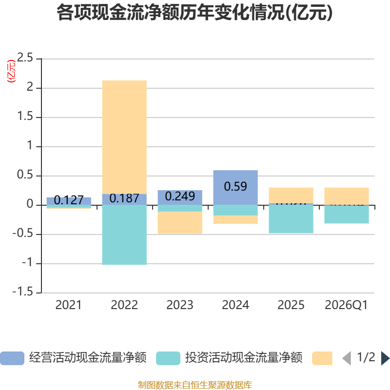 截至2026年一季度末,公司经营活动现金流净额为-139.9万元,同比增加2268.57万元;筹资活动现金流净额2937.74万元,同比减少31.12万元;投资活动现金流净额-3058.45万元,上年同期为4458.44万元。