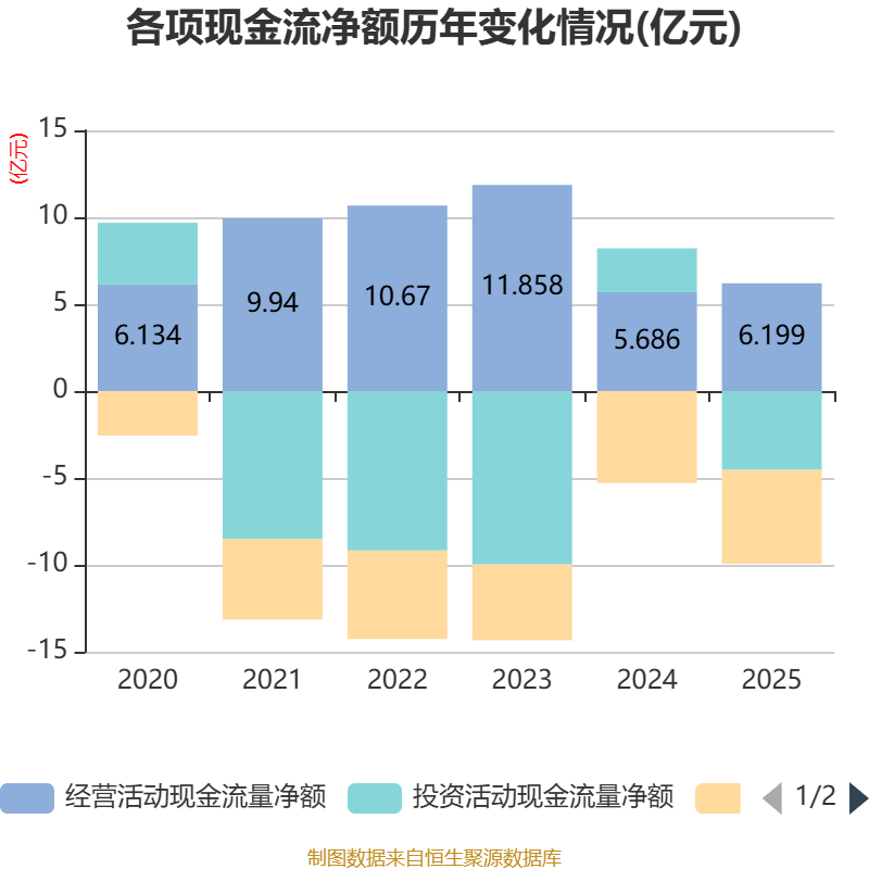 截至2025年,公司经营活动现金流净额为6.2亿元,同比增长9.02%;筹资活动现金流净额-5.4亿元,同比减少1085.33万元;投资活动现金流净额-4.54亿元,上年同期为2.53亿元。