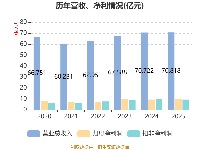 中证智能财讯长江传媒(600757)4月16日披露2025年年度报告。2025年,公司实现营业总收入70.82亿元,同比增长0.14%;归母净利润10.14亿元,同比增长7.39%;扣非净利润9.43亿元,同比下降5.62%;经营活动产生的现金流量净额为6.2亿元,同比增长9.02%;报告期内,长江传媒基本每股收益为0.84元,加权平均净资产收益率为10.44%。公司2025年度分配预案为:拟向全体股东每10股派现4.1元(含税)。
