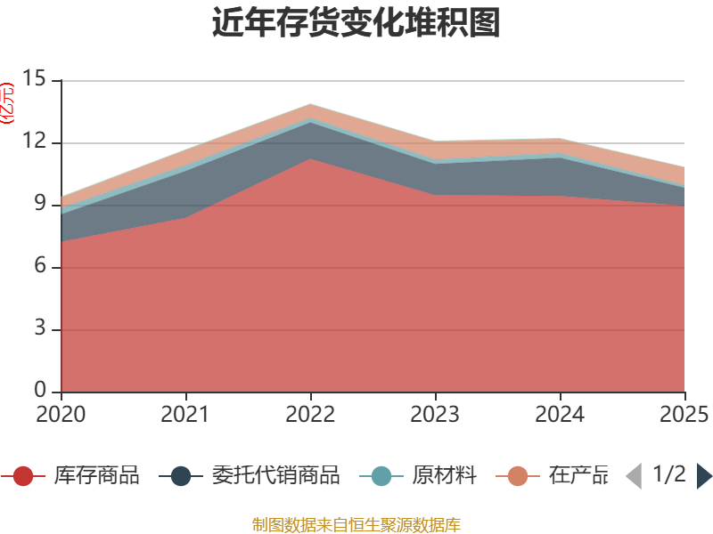 从存货变动来看,截至2025年末,公司存货账面价值为10.81亿元,占净资产的10.8%,较上年末减少1.39亿元。其中,存货跌价准备为3.56亿元,计提比例为24.75%。