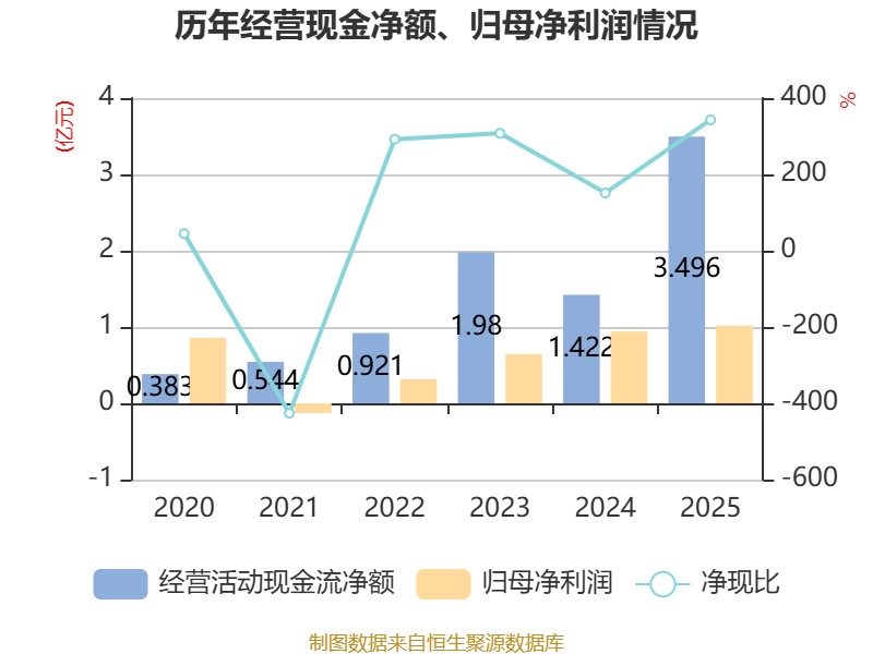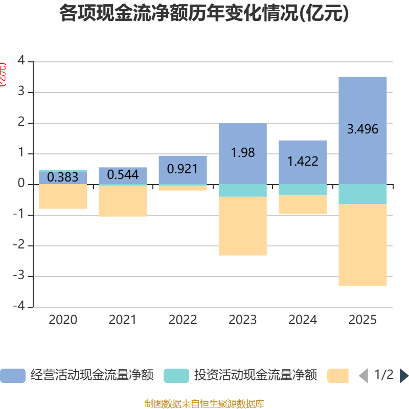 截至2025年,公司经营活动现金流净额为3.5亿元,同比增长145.81%;筹资活动现金流净额-2.66亿元,同比减少2.06亿元;投资活动现金流净额-6568.24万元,上年同期为-3715.71万元。
