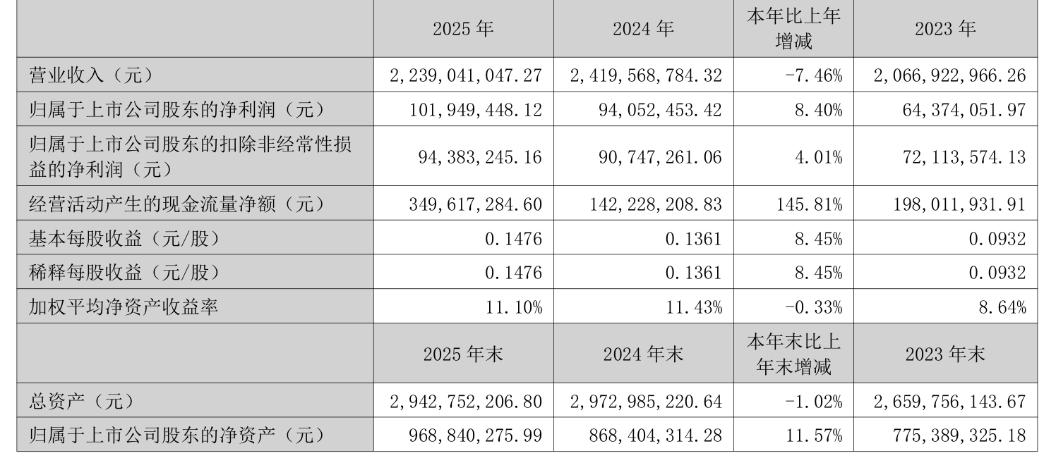 中证智能财讯顺钠股份(000533)4月16日披露2025年年度报告。2025年,公司实现营业总收入22.39亿元,同比下降7.46%;归母净利润1.02亿元,同比增长8.40%;扣非净利润9438.32万元,同比增长4.01%;经营活动产生的现金流量净额为3.5亿元,同比增长145.81%;报告期内,顺钠股份基本每股收益为0.1476元,加权平均净资产收益率为11.10%。