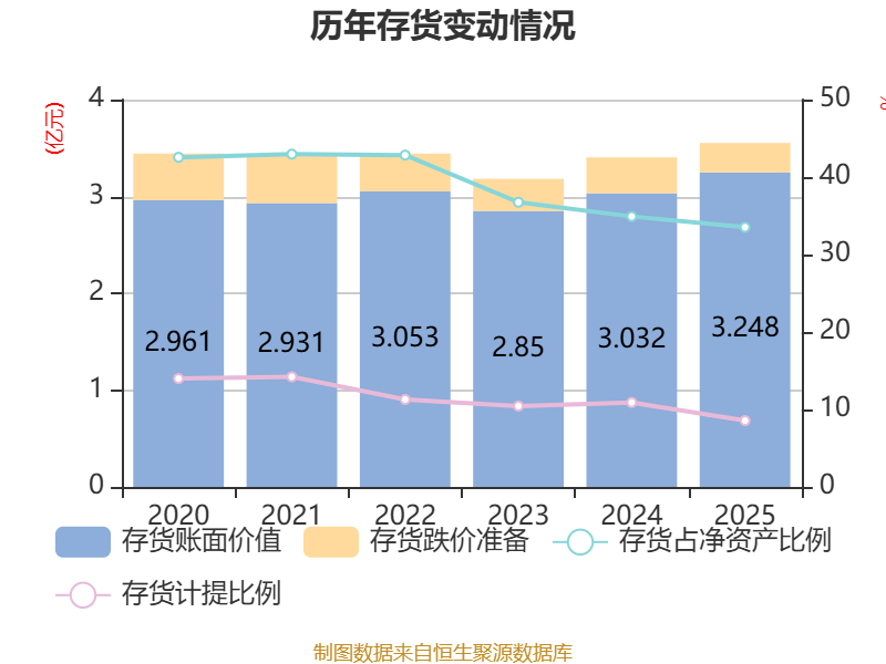 从存货变动来看,截至2025年末,公司存货账面价值为3.25亿元,占净资产的33.52%,较上年末增加2160.07万元。其中,存货跌价准备为3039.34万元,计提比例为8.56%。