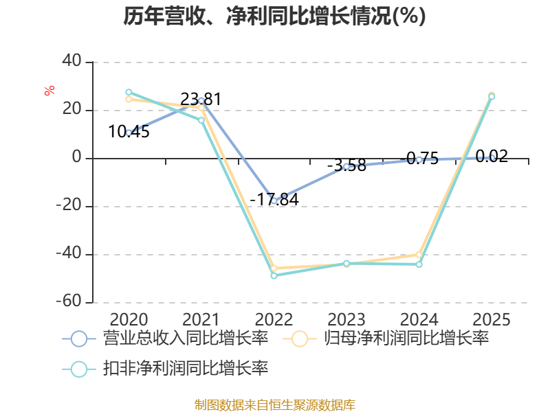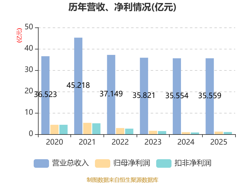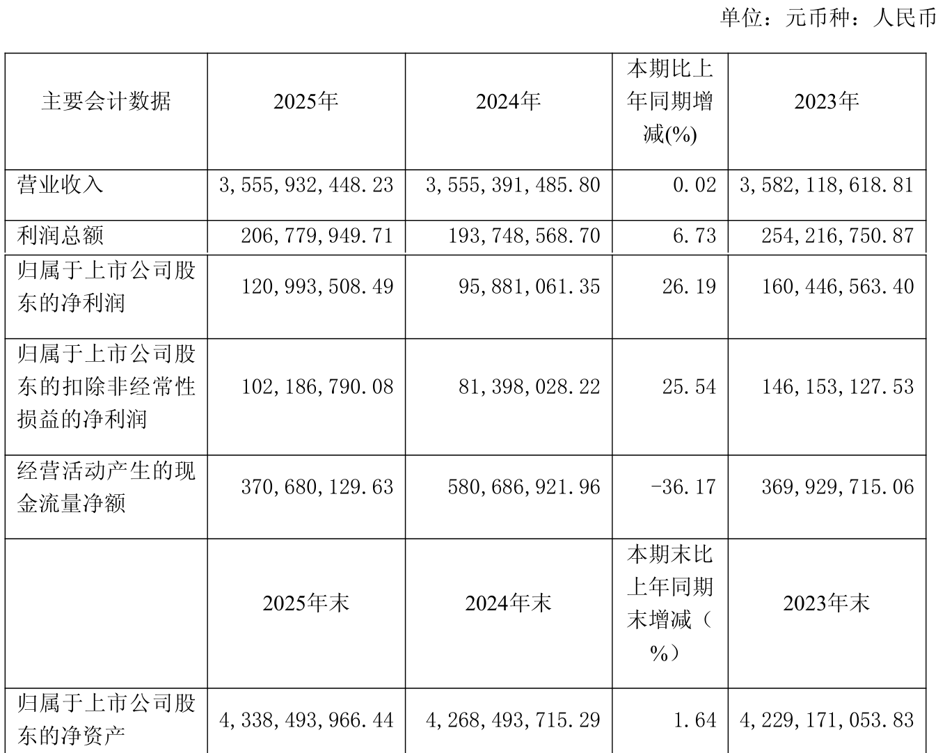 中证智能财讯苏博特(603916)4月16日披露2025年年度报告。2025年,公司实现营业总收入35.56亿元,同比增长0.02%;归母净利润1.21亿元,同比增长26.19%;扣非净利润1.02亿元,同比增长25.54%;经营活动产生的现金流量净额为3.71亿元,同比下降36.17%;报告期内,苏博特基本每股收益为0.29元,加权平均净资产收益率为2.81%。公司2025年度分配预案为:拟向全体股东每10股派现1.2元(含税)。