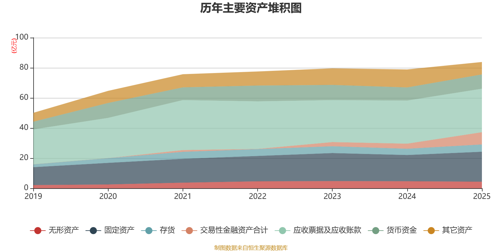 资产重大变化方面,截至2025年末,公司交易性金融资产合计较上年末增加142.96%,占公司总资产比重上升5.46个百分点;在建工程合计较上年末减少98.57%,占公司总资产比重下降3.83个百分点;应收票据及应收账款较上年末增加0.75%,占公司总资产比重下降1.88个百分点;固定资产较上年末增加14.22%,占公司总资产比重上升1.66个百分点。