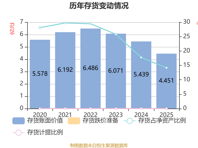 从存货变动来看,截至2025年末,公司存货账面价值为4.45亿元,占净资产的14.17%,较上年末减少9879.63万元。公司本期没有计提存货跌价准备。