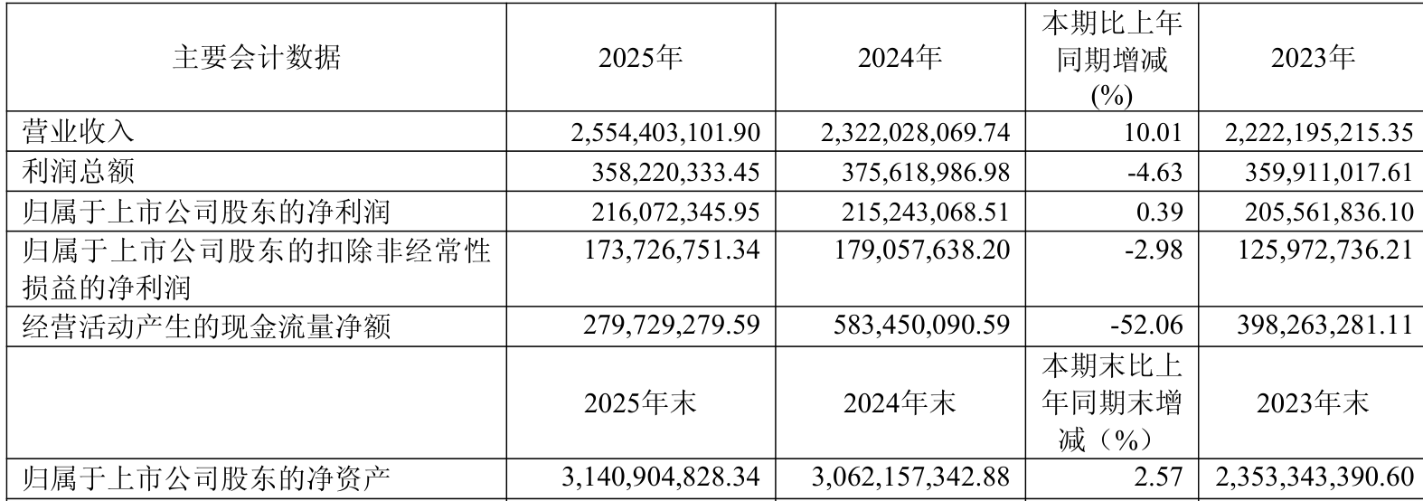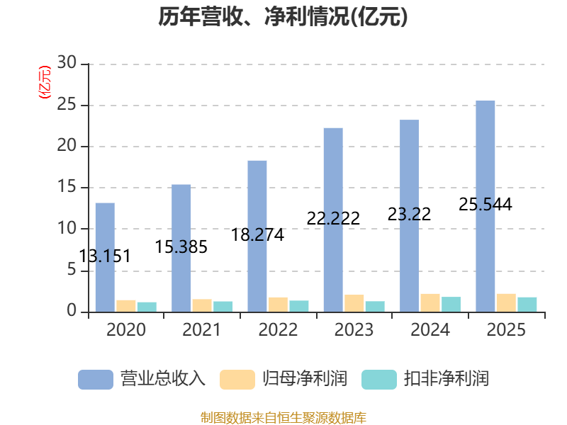 中证智能财讯钱江水利(600283)4月16日披露2025年年度报告。2025年,公司实现营业总收入25.54亿元,同比增长10.01%;归母净利润2.16亿元,同比增长0.39%;扣非净利润1.74亿元,同比下降2.98%;经营活动产生的现金流量净额为2.8亿元,同比下降52.06%;报告期内,钱江水利基本每股收益为0.43元,加权平均净资产收益率为6.94%。公司2025年度分配预案为:拟向全体股东每10股派现2.5元(含税)。
