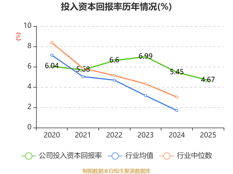 数据显示,2025年公司加权平均净资产收益率为6.94%,较上年同期下降1.93个百分点。公司2025年投入资本回报率为4.67%,较上年同期下降0.78个百分点。