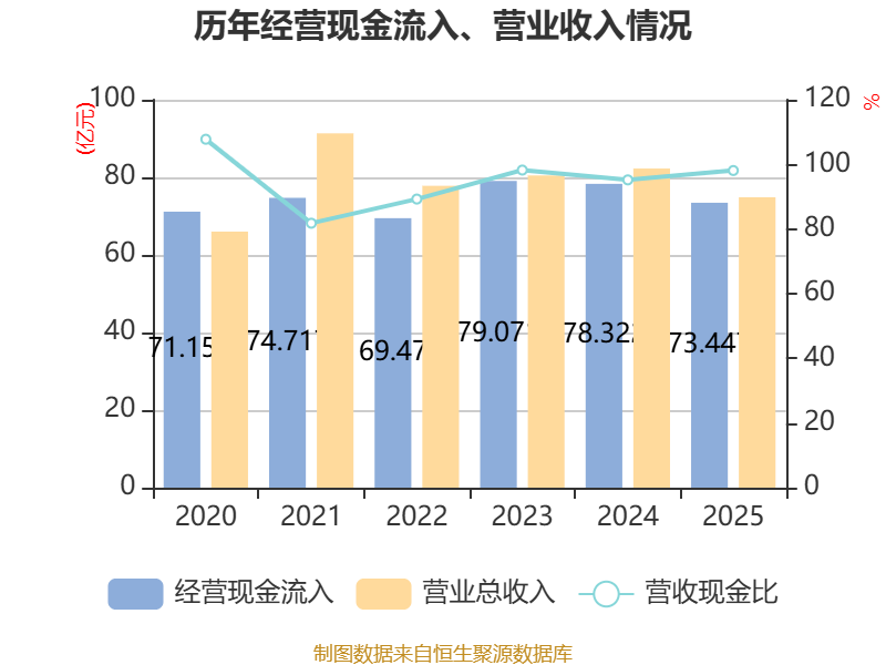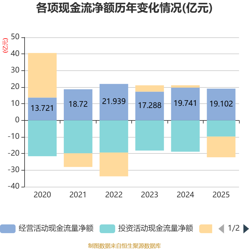 截至2025年,公司经营活动现金流净额为19.1亿元,同比下降3.24%;筹资活动现金流净额-12.47亿元,同比减少13.86亿元;投资活动现金流净额-9.76亿元,上年同期为-18.89亿元。
