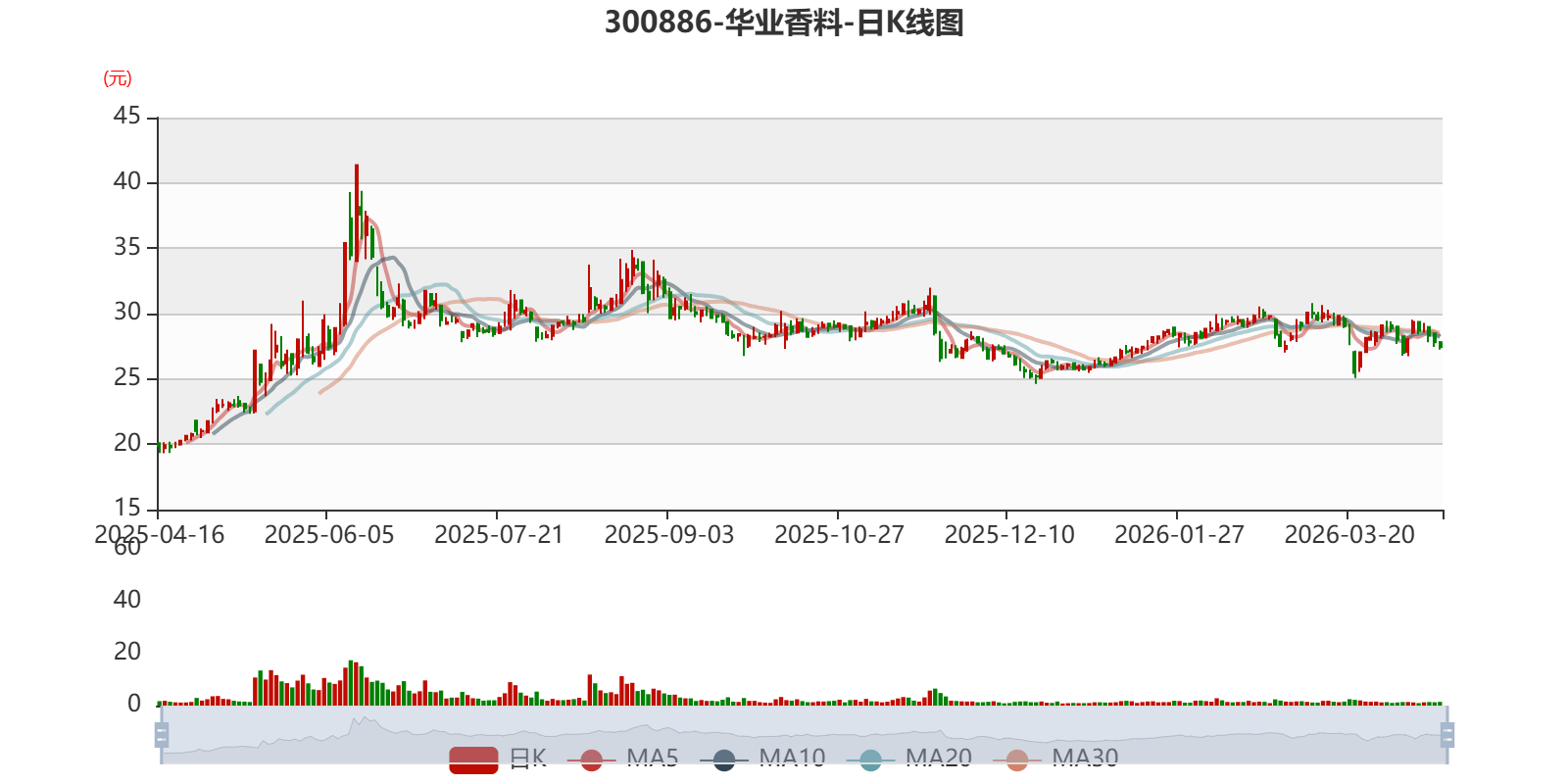 中证智能财讯华业香料(300886)4月16日披露2025年年度报告。2025年,公司实现营业总收入3.72亿元,同比增长7.83%;归母净利润3021.73万元,同比增长36.79%;扣非净利润2932.03万元,同比增长53.10%;经营活动产生的现金流量净额为1626.3万元,同比下降20.36%;报告期内,华业香料基本每股收益为0.4045元,加权平均净资产收益率为5.22%。公司2025年度分配预案为:拟向全体股东每10股派现0.5元(含税)。