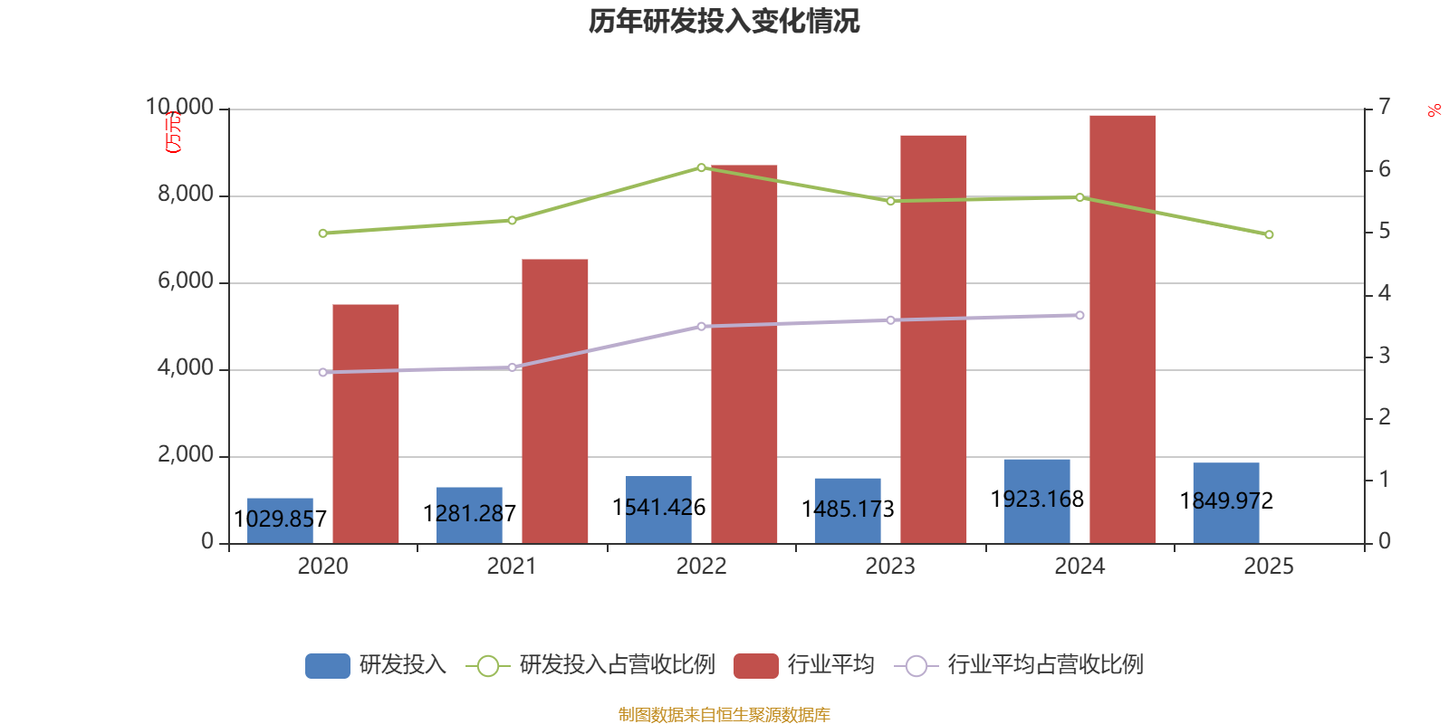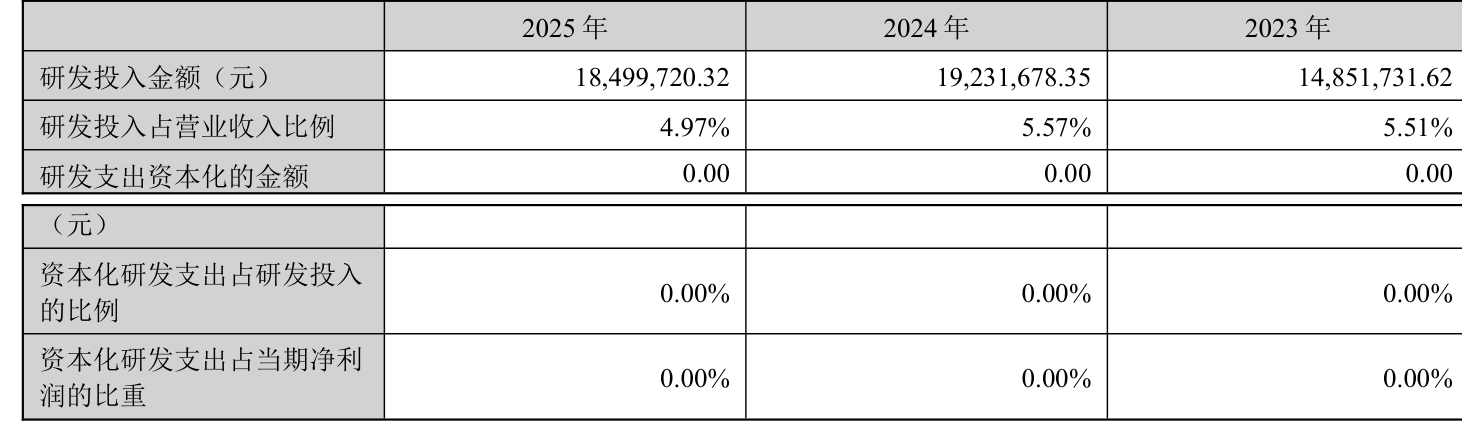 2025年全年,公司研发投入金额为1849.97万元,同比下降3.81%;研发投入占营业收入比例为4.97%,相比上年同期下降0.6个百分点。此外,公司全年研发投入资本化率为0%。