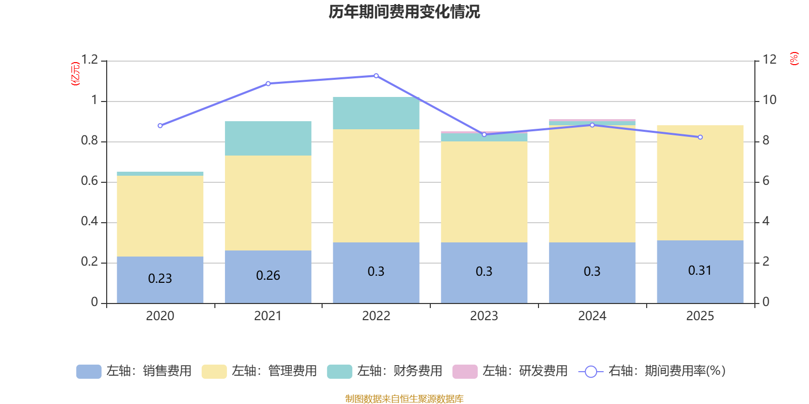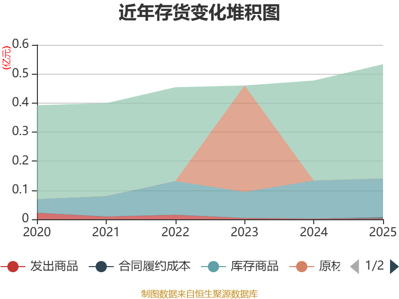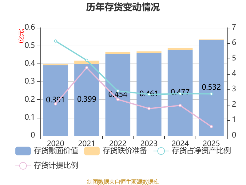 从存货变动来看,截至2025年末,公司存货账面价值为5324.47万元,占净资产的2.71%,较上年末增加551.58万元。其中,存货跌价准备为31.42万元,计提比例为0.59%。