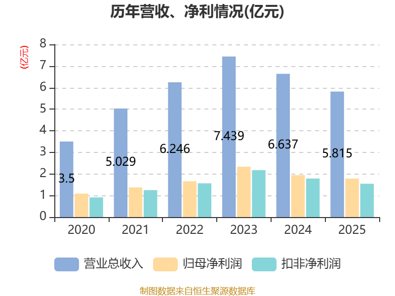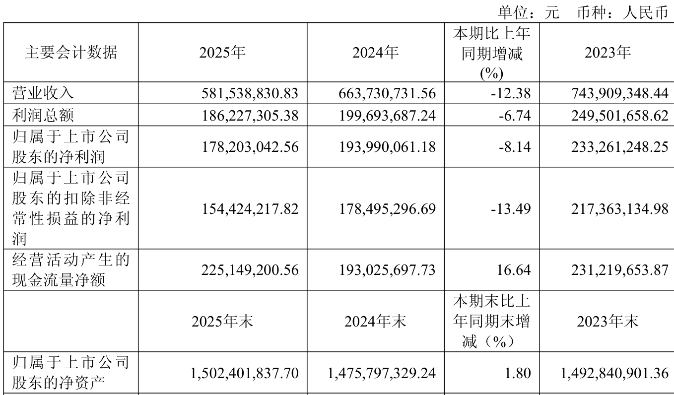 中证智能财讯顶点软件(603383)4月16日披露2025年年度报告。2025年,公司实现营业总收入5.82亿元,同比下降12.38%;归母净利润1.78亿元,同比下降8.14%;扣非净利润1.54亿元,同比下降13.49%;经营活动产生的现金流量净额为2.25亿元,同比增长16.64%;报告期内,顶点软件基本每股收益为0.87元,加权平均净资产收益率为11.92%。公司2025年度分配预案为:拟向全体股东每10股派现6元(含税)。