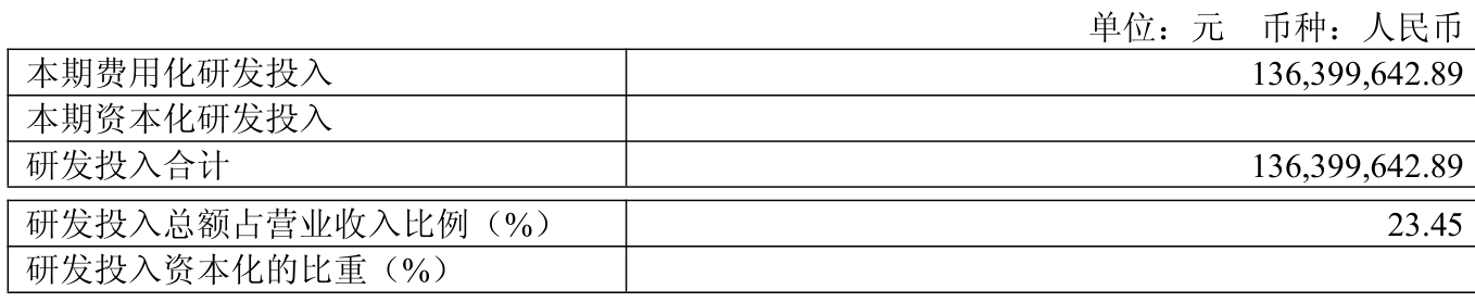 2025年全年,公司研发投入金额为1.36亿元,同比下降10.54%;研发投入占营业收入比例为23.45%,相比上年同期上升0.48个百分点。此外,公司全年研发投入资本化率为0%。