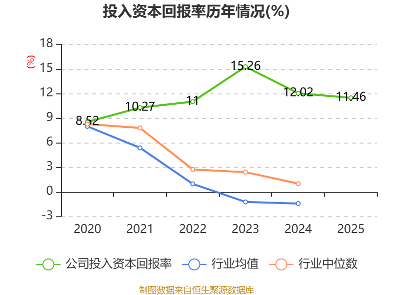 数据显示,2025年公司加权平均净资产收益率为11.92%,较上年同期下降1.17个百分点。公司2025年投入资本回报率为11.46%,较上年同期下降0.56个百分点。