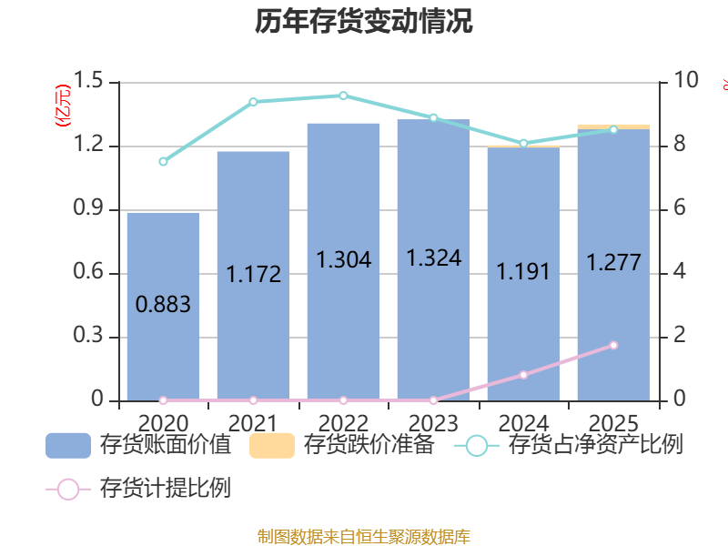 从存货变动来看,截至2025年末,公司存货账面价值为1.28亿元,占净资产的8.5%,较上年末增加854.04万元。其中,存货跌价准备为224.89万元,计提比例为1.73%。
