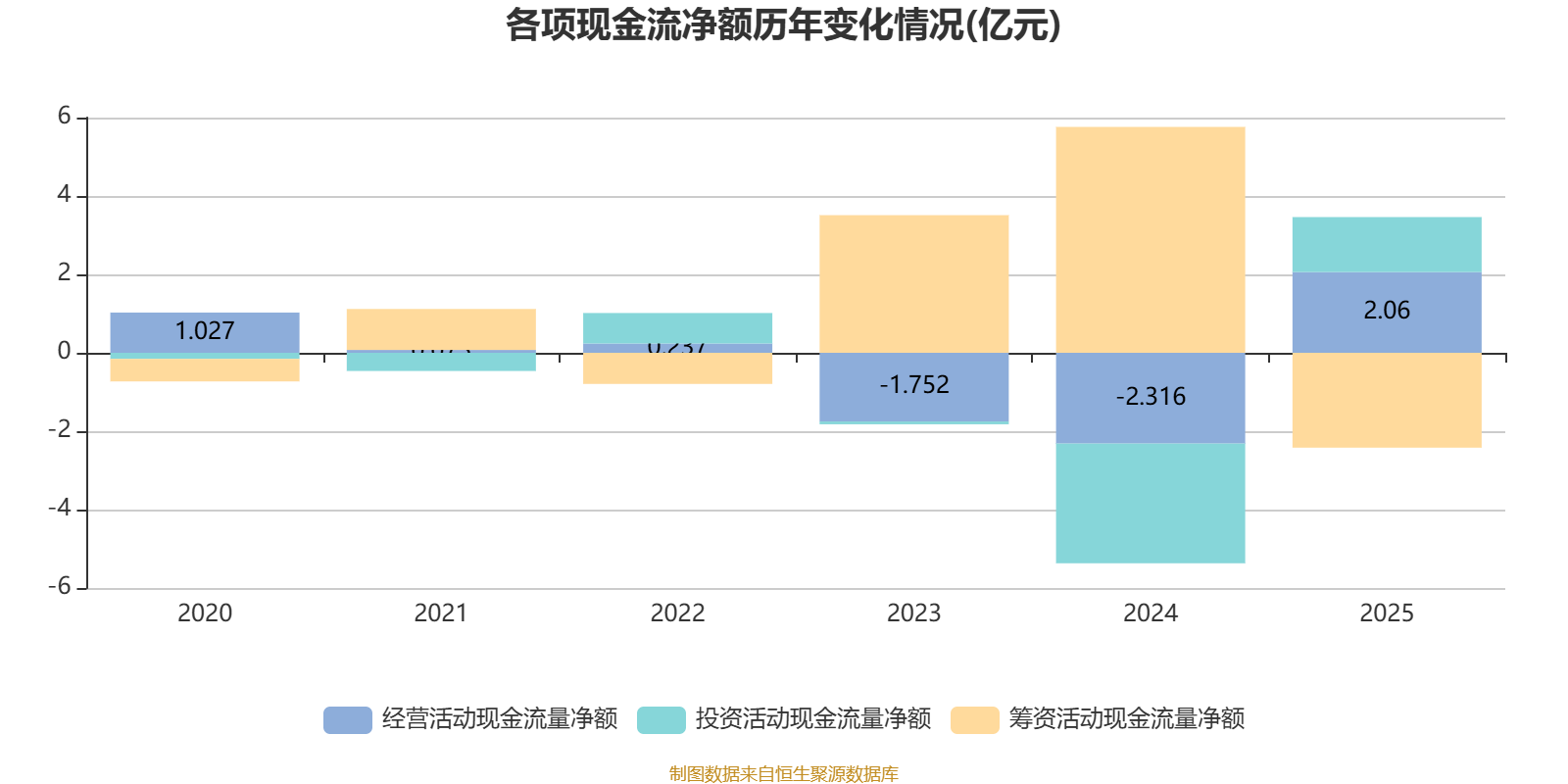 2025年,公司经营活动现金流净额为2.06亿元,同比增加4.38亿元;筹资活动现金流净额-2.42亿元,同比减少8.18亿元;投资活动现金流净额1.4亿元,上年同期为-3.05亿元。