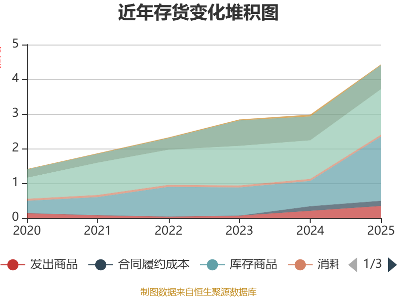 从存货变动来看,截至2025年末,公司存货账面价值为4.43亿元,占净资产的12.96%,较上年末增加1.45亿元。其中,存货跌价准备为148.88万元,计提比例为0.34%。