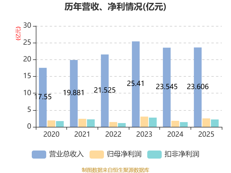 中证智能财讯国泰集团(603977)4月16日披露2025年年度报告。2025年,公司实现营业总收入23.61亿元,同比增长0.26%;归母净利润2.52亿元,同比增长39.55%;扣非净利润2.2亿元,同比增长55.60%;经营活动产生的现金流量净额为1.94亿元,同比下降27.27%;报告期内,国泰集团基本每股收益为0.41元,加权平均净资产收益率为7.62%。公司2025年度分配预案为:拟向全体股东每10股派现1.3元(含税)。