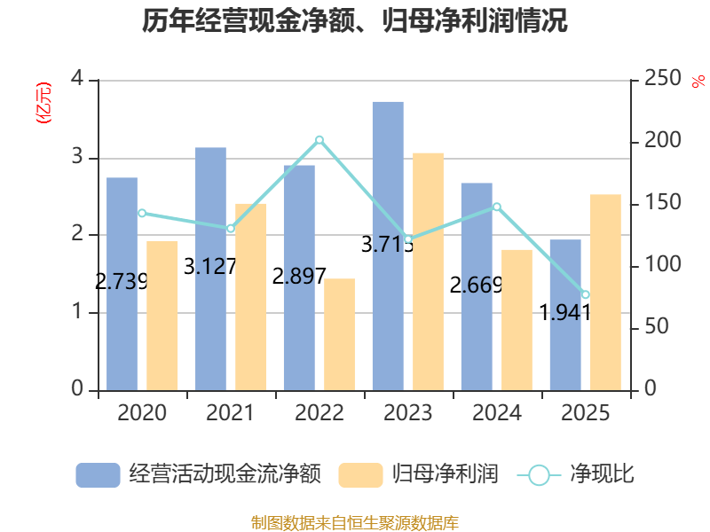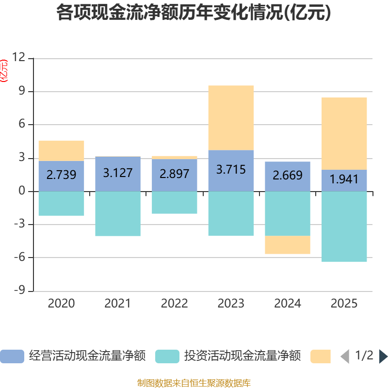 截至2025年,公司经营活动现金流净额为1.94亿元,同比下降27.27%;筹资活动现金流净额6.52亿元,同比增加8.14亿元;投资活动现金流净额-6.37亿元,上年同期为-4.03亿元。