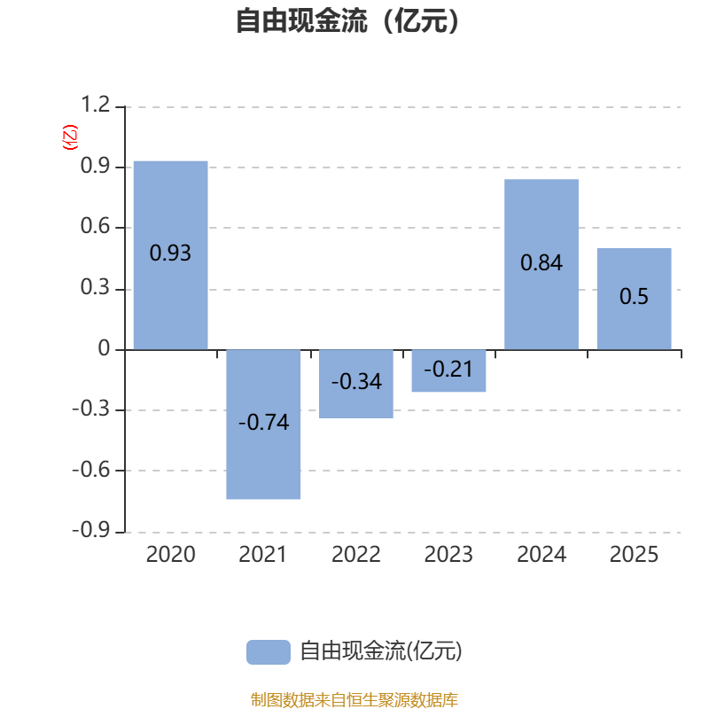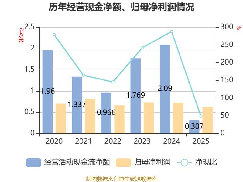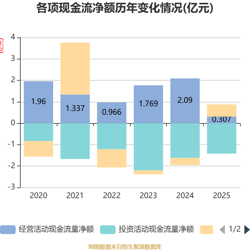 截至2025年,公司经营活动现金流净额为3072.29万元,同比下降85.3%;筹资活动现金流净额5727.8万元,同比增加9031.7万元;投资活动现金流净额-1.42亿元,上年同期为-1.62亿元。