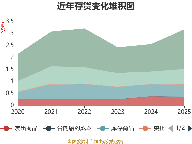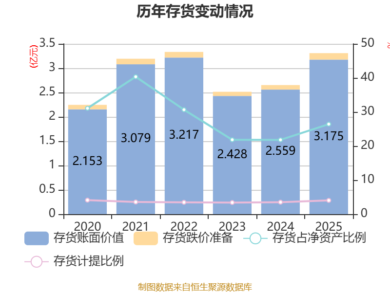 从存货变动来看,截至2025年末,公司存货账面价值为3.17亿元,占净资产的26.42%,较上年末增加6154.04万元。其中,存货跌价准备为1331.59万元,计提比例为4.03%。