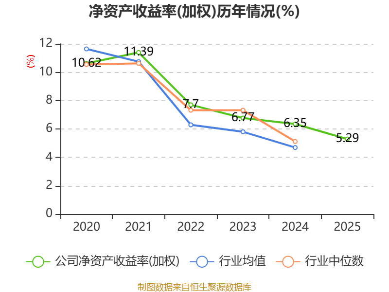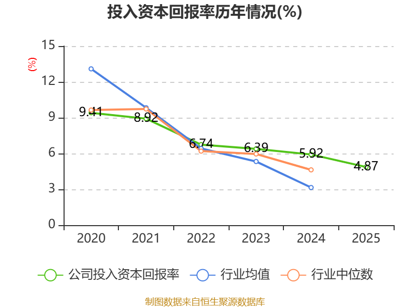 数据显示,2025年公司加权平均净资产收益率为5.29%,较上年同期下降1.06个百分点。公司2025年投入资本回报率为4.87%,较上年同期下降1.05个百分点。