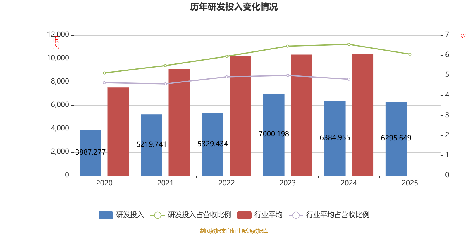 2025年全年,公司研发投入金额为6295.65万元,同比下降1.4%;研发投入占营业收入比例为6.05%,相比上年同期下降0.49个百分点。此外,公司全年研发投入资本化率为0。