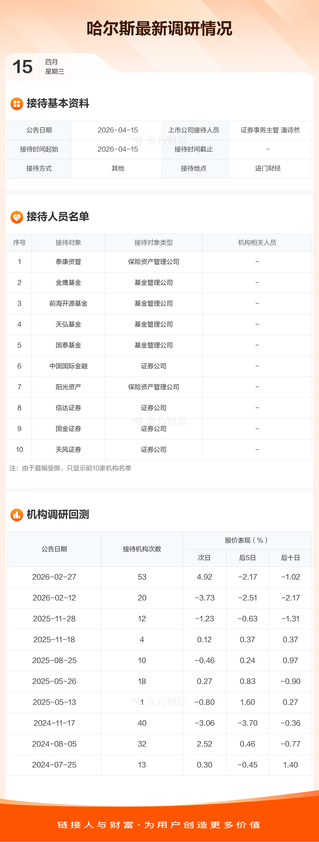 哈尔斯4月15日公告称,4月15日接待泰康资管等23家机构调研。接待人员包括证券事务主管 潘诗然。