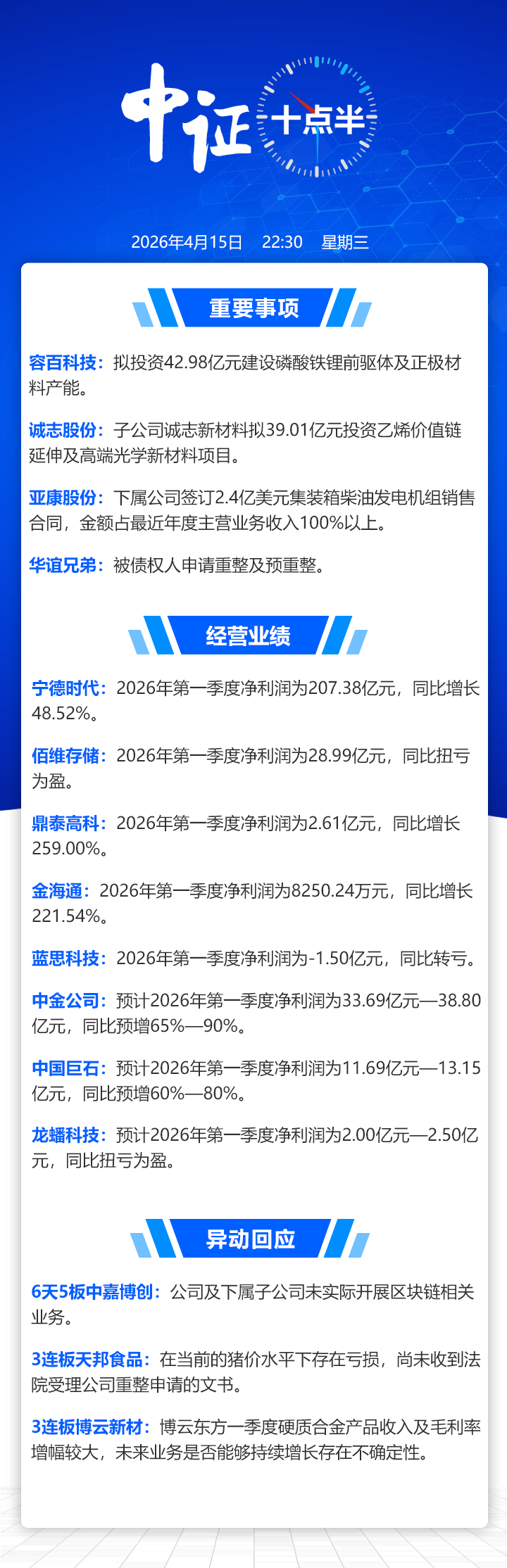 【中证十点半】容百科技拟42.98亿元建设磷酸铁锂前驱体及正极材料产能;华谊兄弟被债权人申请重整及预重整