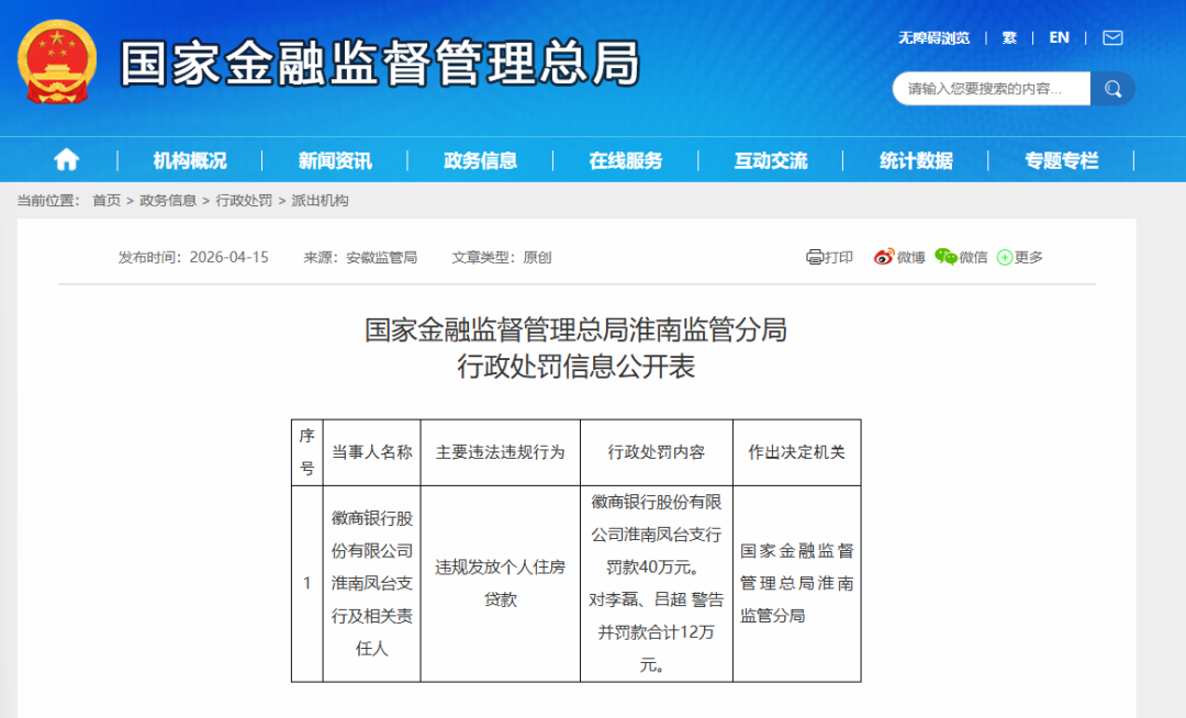 4月15日,国家金融监督管理总局淮南监管分局披露的行政处罚公告显示,因违规发放个人住房贷款,徽商银行淮南凤台支行被罚款40万元,两名涉事责任人被连带处罚。