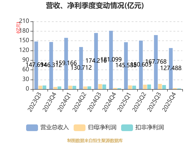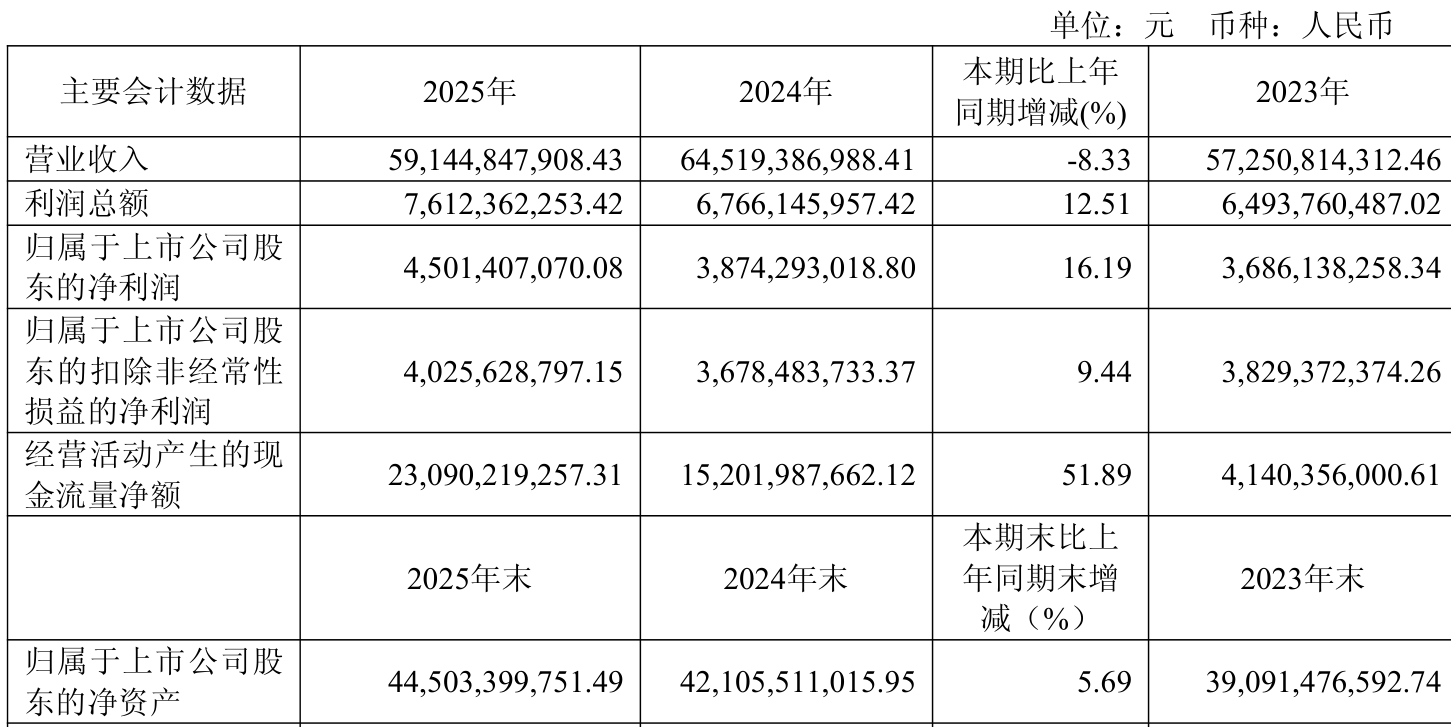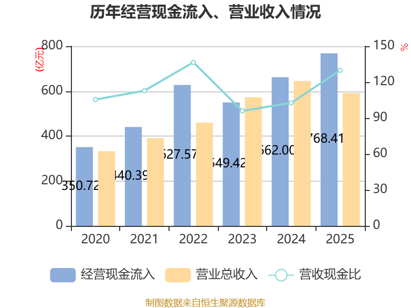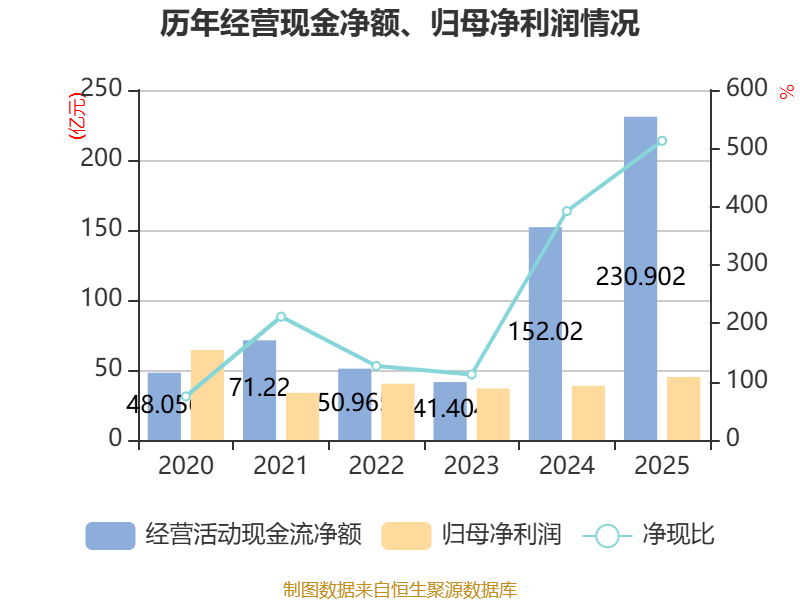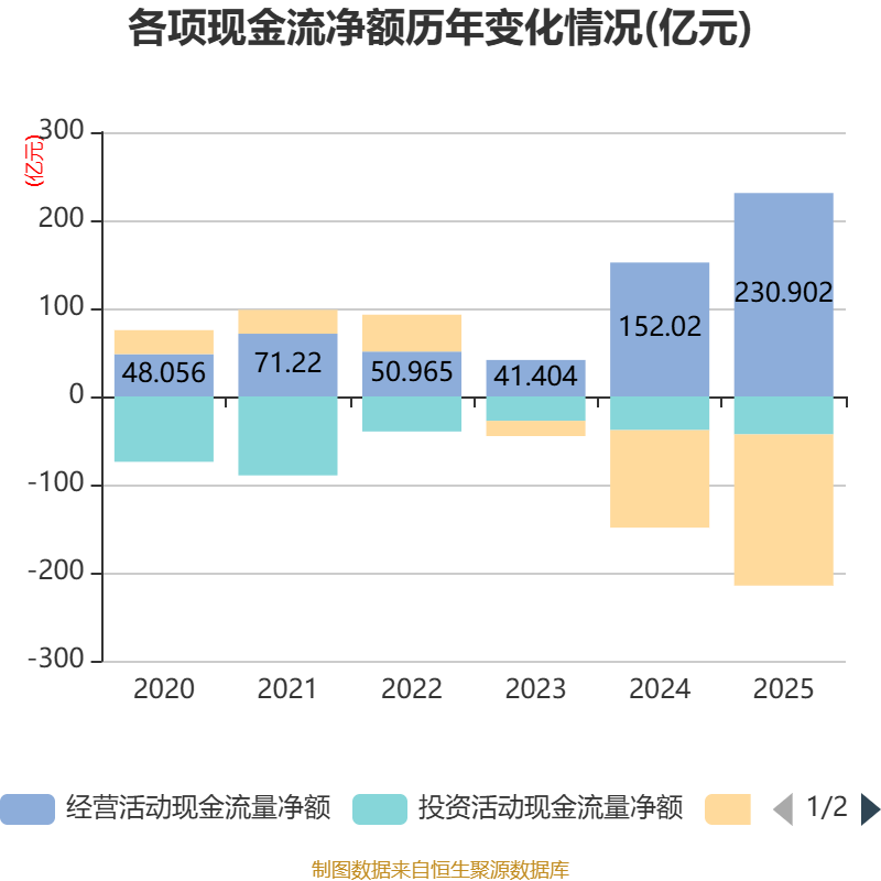 截至2025年,公司经营活动现金流净额为230.9亿元,同比增长51.89%;筹资活动现金流净额-171.64亿元,同比减少60.96亿元;投资活动现金流净额-43.06亿元,上年同期为-38.23亿元。