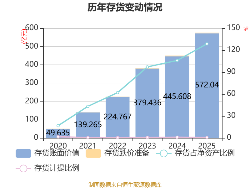 从存货变动来看,截至2025年末,公司存货账面价值为572.04亿元,占净资产的128.54%,较上年末增加126.43亿元。其中,存货跌价准备为3.73亿元,计提比例为0.65%。