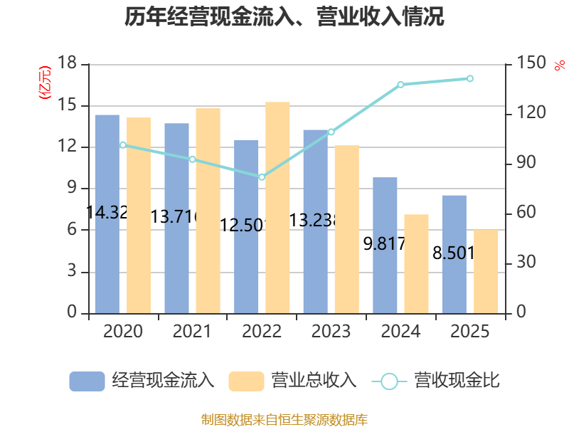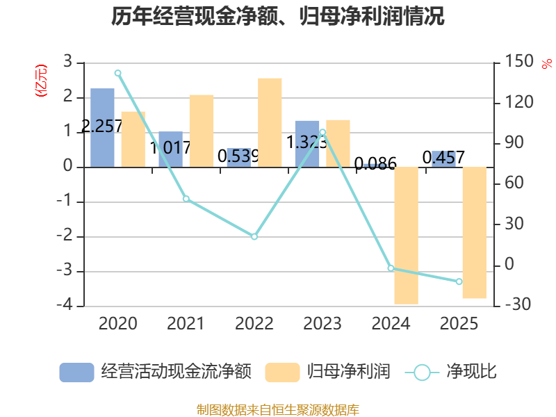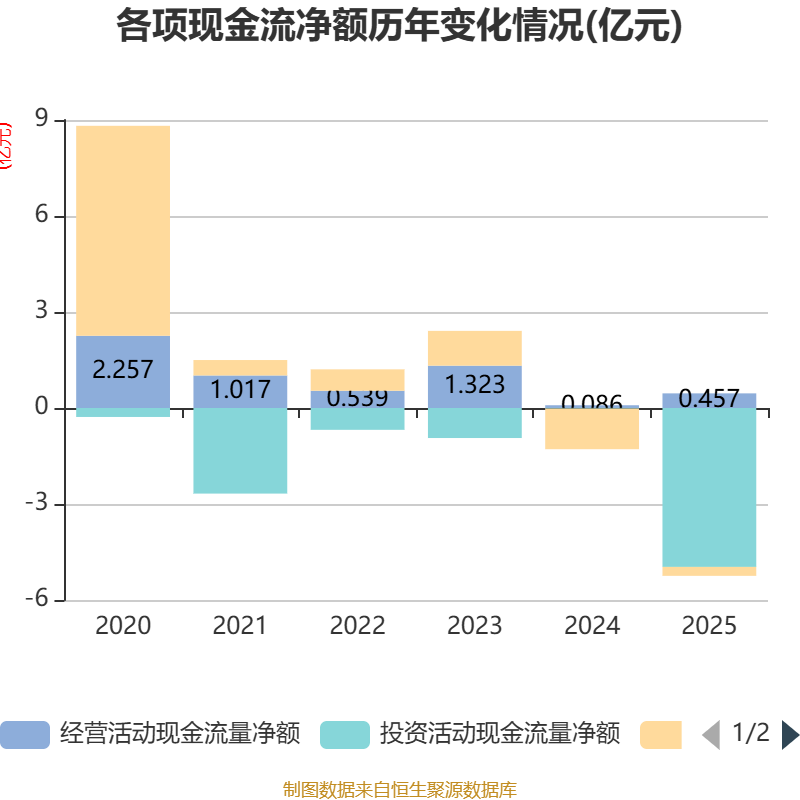 截至2025年,公司经营活动现金流净额为4570.41万元,同比增长429.63%;筹资活动现金流净额-2791.74万元,同比增加9888.2万元;投资活动现金流净额-4.97亿元,上年同期为-189.58万元。
