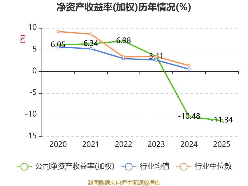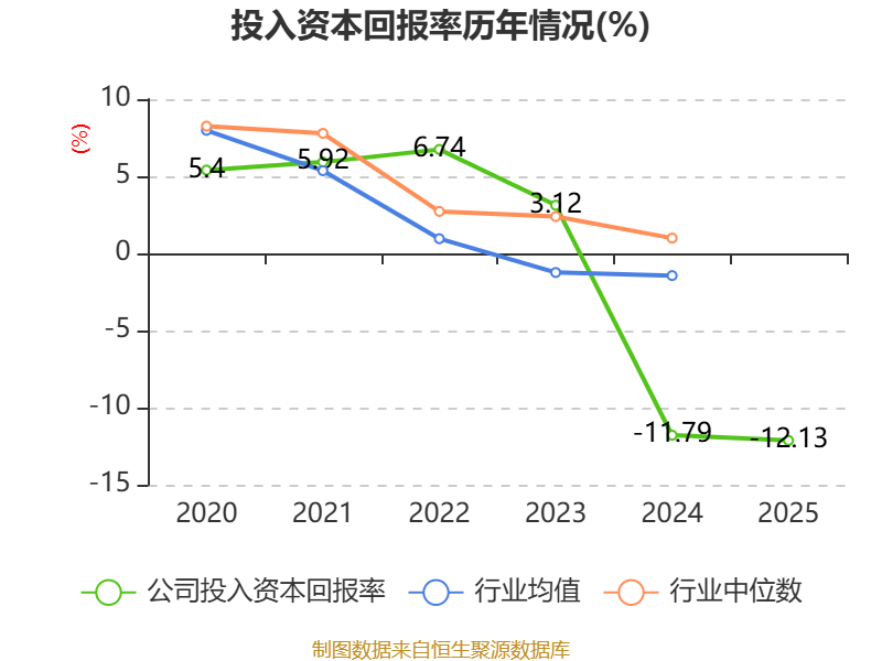数据显示,2025年公司加权平均净资产收益率为-11.34%,较上年同期下降0.86个百分点。公司2025年投入资本回报率为-12.13%,较上年同期下降0.34个百分点。