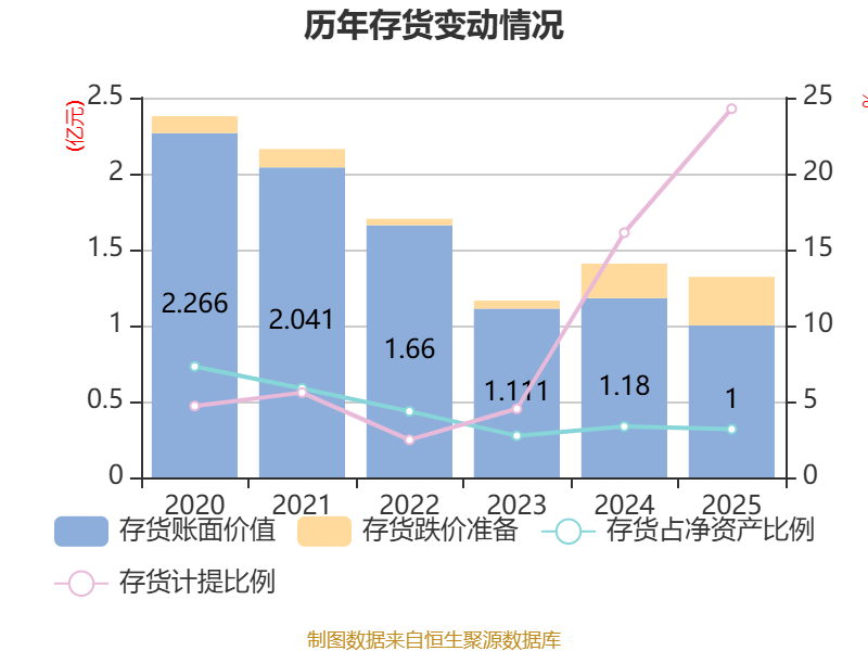 从存货变动来看,截至2025年末,公司存货账面价值为9998.23万元,占净资产的3.17%,较上年末减少1797.69万元。其中,存货跌价准备为3204.24万元,计提比例为24.27%。