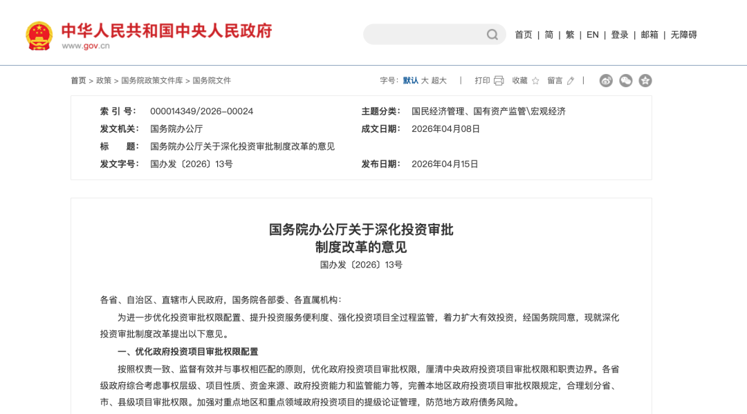 4月15日,国务院办公厅发布《关于深化投资审批制度改革的意见》(以下简称《意见》)。