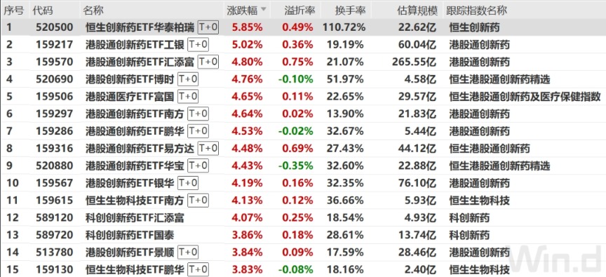 紧随其后的是港股通创新药ETF工银、港股通创新药ETF汇添富,单日涨幅分别为5.02%、4.80%,成交额分别为11.81亿元、57.76亿元。